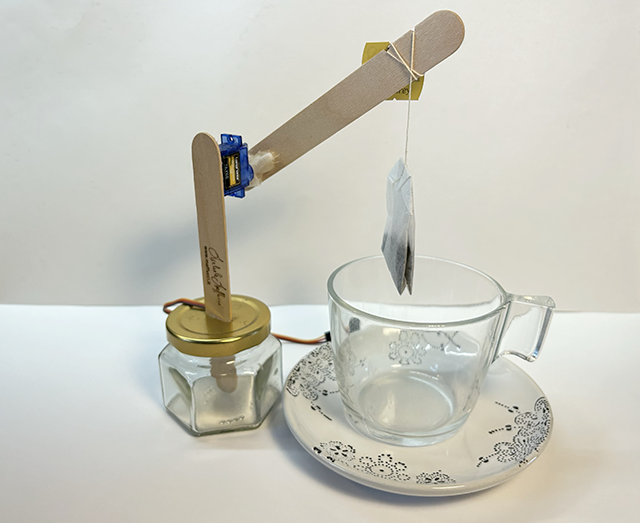 - il primo progetto permette di realizzare un sistema oscillante in cui il tempo di oscillazione e immersione della bustina è fissato all’interno del codice e la struttura meccanica è semplificata e realizzata con oggetti di recupero.