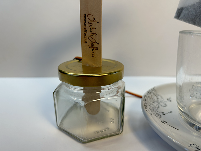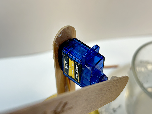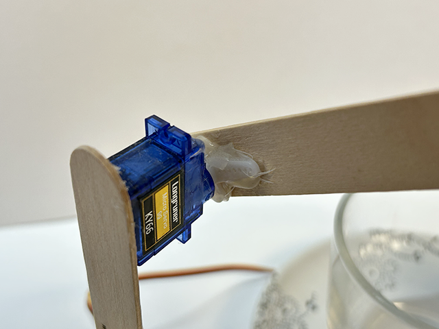 La struttura, come mostrato nell’immagine precedente, consiste di due bacchette di legno, una vincolata ad un’estremità ad un barattolo di vetro in modo da avere una base di appoggio e l’altra ad un servomotore.