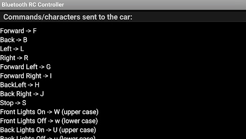 Una delle applicazioni più note per effettuare il controllo via Bluetooth di un robot è: “Bluetooth RC Controller”. Nell’applicazione selezionando “Settings” (icona ingranaggio), aprirà una finestra in cui trovate quali caratteri vengono inviati sulla seriale via Bluetooth agendo sull’interfaccia di controllo e noterete immediatamente che la funzione switch all’interno dello sketch non fa altro che intercettare i caratteri F, B, L, R, che identificano: Forward (avanti), Back (indietro), Left (sinistra), Right (destra).