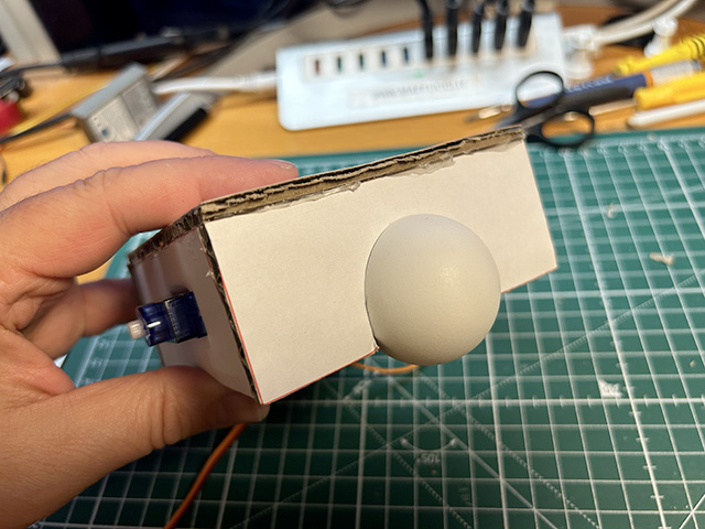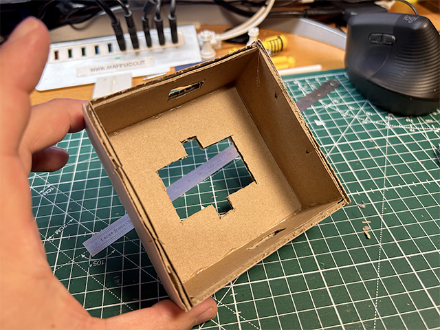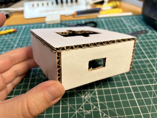 Volutamente compatto e simmetrico, le dimensioni sono di 10×10 cm, ha la forma di una scatolina, le cui falde sono state unite con colla a caldo. Questa scelta di assemblaggio, suggerita dai colleghi della primaria, ha reso il processo di assemblaggio non solo più sicuro ma anche più rapido rispetto alla prima versione in cui utilizzavo viti, ciò ha semplificato e velocizzato la fase costruttiva.