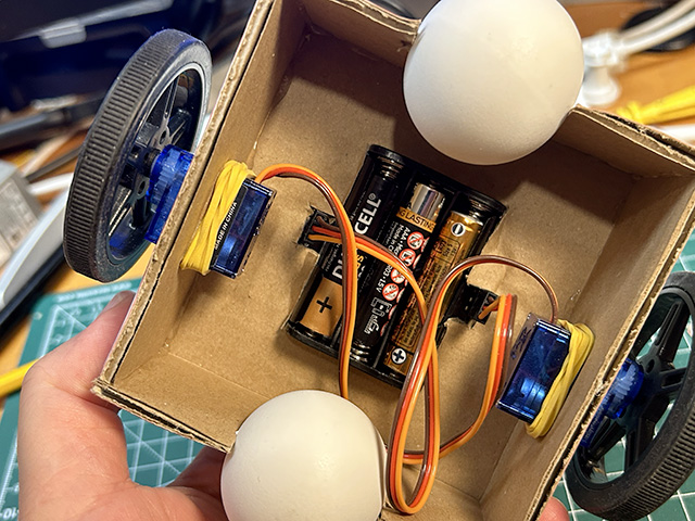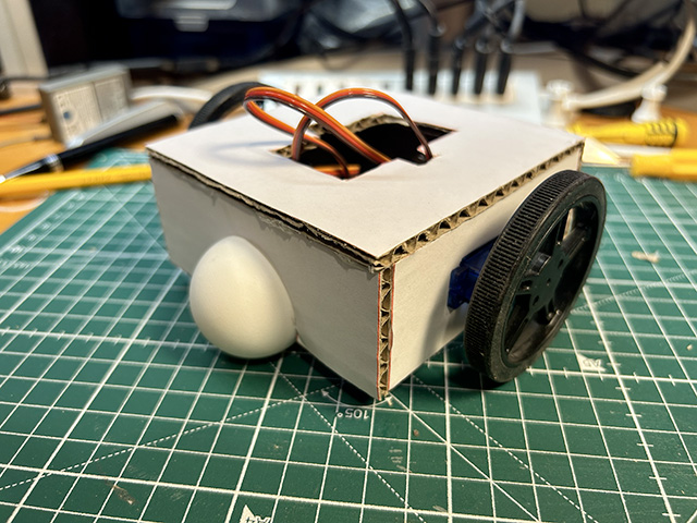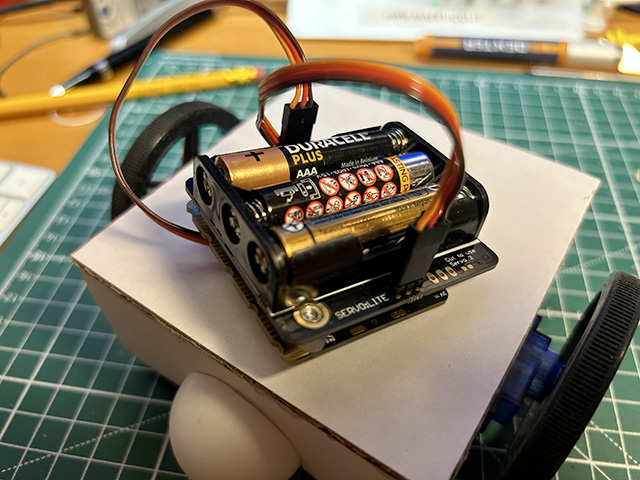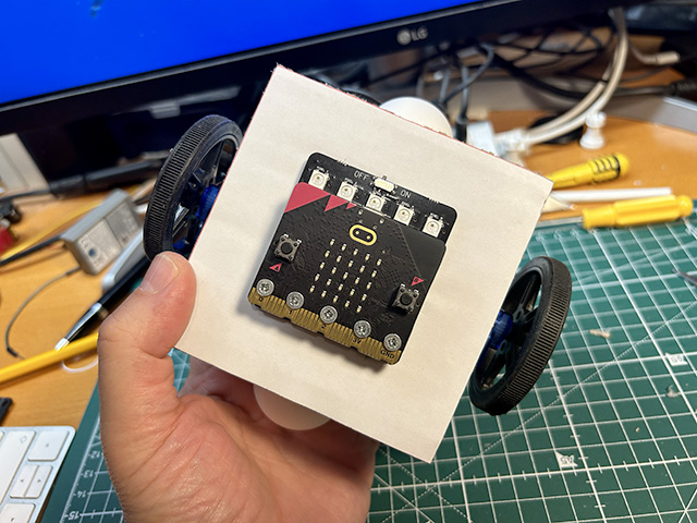Il piccolo robot è controllato da BBC micro:bit ed il controllo motori è affidato a :MOVE di Kitronik, una soluzione intuitiva che permette una facile gestione dei servomotori a rotazione continua. Questi ultimi, fissati alla struttura senza viti ma con l’ausilio di elastici, conferiscono al robot una grande praticità di montaggio e manutenzione.