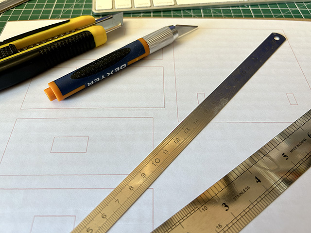 Per il taglio dei rettangoli che ospiteranno i motori e i fori passanti per i cavi, consiglio di effettuare con un punteruolo fori per ogni angolo e poi procedere con il taglio.