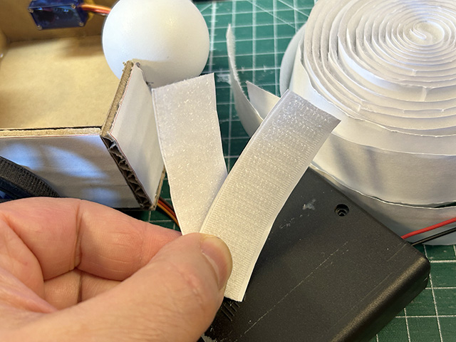 Procuratevi del velcro e tagliate un pezzo da 6 cm di lunghezza, incollate una striscia sul pacco batteria (contenitore con interruttore da 4 batterie da 1,5 V AA) ed una nella parte interna della scatola così come indicato nell’immagine che segue: