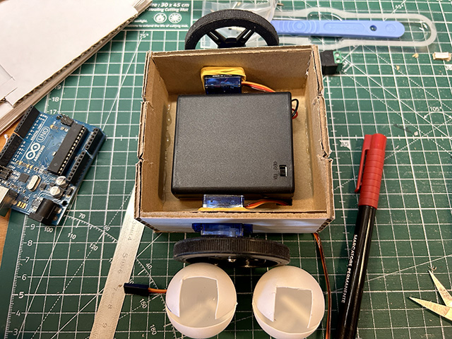 La modalità costruttiva per questa versione Arduino è la medesima di quella realizzata per la versione BBC micro:bit con scheda motori :MOVE, sono presenti però alcune piccole differenze nella faccia superiore, nel taglio delle palline da Ping Pong utilizzate come Caster Ball e nell’uso di un pacco batteria posto nella parte interna del robot, fate riferimento a questo breve tutorial ed utilizzate il PDF allegato effettuare i tagli.