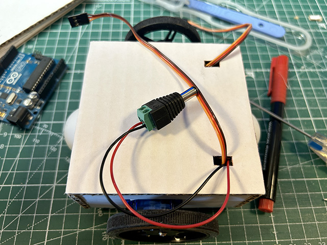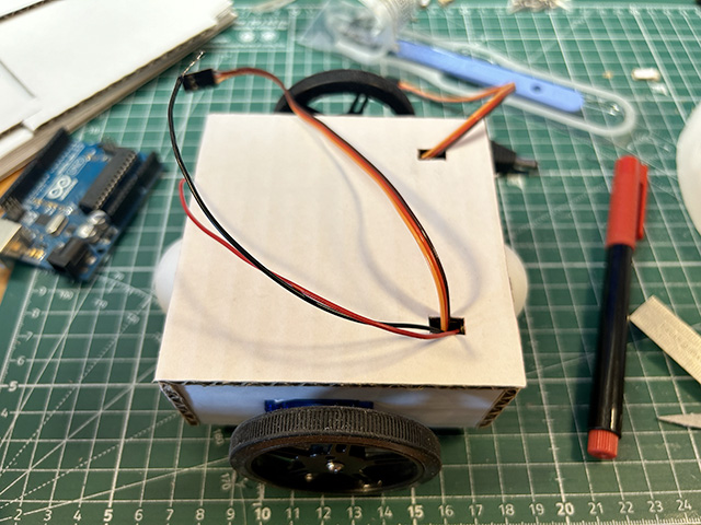 Incastrate le palline nelle fessure e fate passare i cavi dei servomotori e quelli dell’alimentazione attraverso i fori della base:
