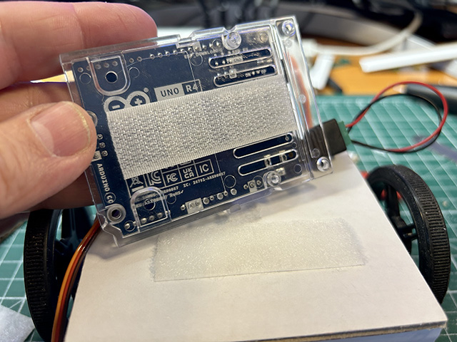 Incollate sotto la base di supporto della scheda Arduino UNO R4 un pezzo di velcro della lunghezza di 6 cm.