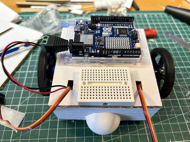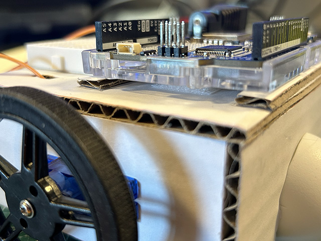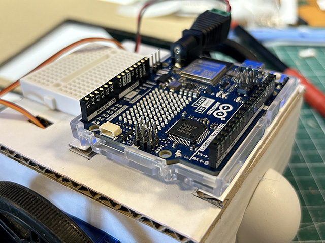 Fissate la scheda Arduino al robot e dalla parte opposta incollate una piccola breadboar da 170 punti così come indicata nell’immagine: