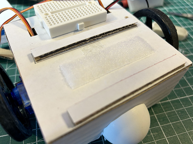 Per rendere più stabile la scheda Arduino ritagliate dal cartone che vi è avanzato due strisce di cartone e incollatele sulla base in modo che siano allineate ai lati più lunghi della scheda: