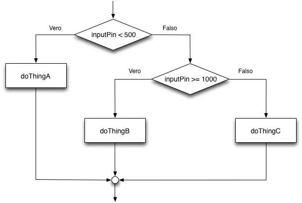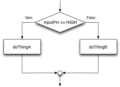 Nota: una istruzione if verifica semplicemente se la condizione all’interno delle parentesi tonde è vera o falsa. Nell’esempio, se if (inputPin == HIGH) risulta vera, cioè inputPin ha un valore HIGH (+5V) viene eseguita la porzione di codice doTingA, in caso contrario viene eseguita la porzione di codice che segue l’else: doThingB