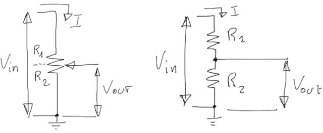 Il cursore del trimmer, rappresentato dalla freccia nel simbolo elettronico, o dalla vite nell’immagine prima esposta, può passare da un estremo all’altro dove è collegata direttamente a massa (0 V) oppure all’alimentazione alla Vin nel nostro caso 5 V, passando attraverso tutte le posizioni intermedie, si potrà quindi dosare la tensione sul piedino centrale (V out) come frazione della tensione di alimentazione: