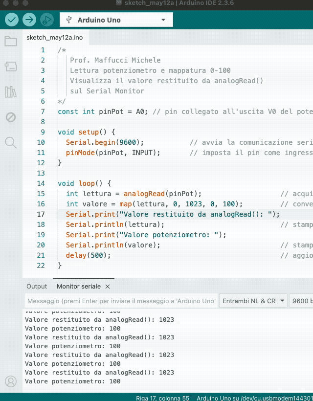 Il potenziometro restituisce un valore compreso tra 0 e 1023. Per ottenere variazioni più precise – e un numero più intuitivo se decideremo di usarlo in seguito – rimappiamo questi valori nel range 0-100.