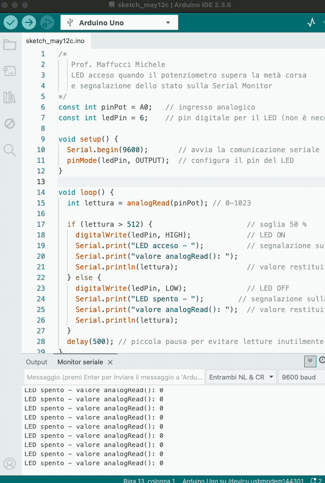 il LED si accende solo quando il potenziometro supera il 50 % del suo giro (circa 512 su 1023). In caso contrario rimane spento. Sulla Serial Monitor viene indicato lo stato del LED ed il valore restituito dall’analogRead().