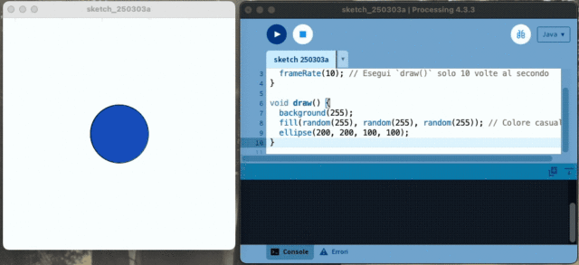 Per impostazione predefinita, Processing esegue draw() circa 60 volte al secondo. Possiamo modificare questa velocità con frameRate().