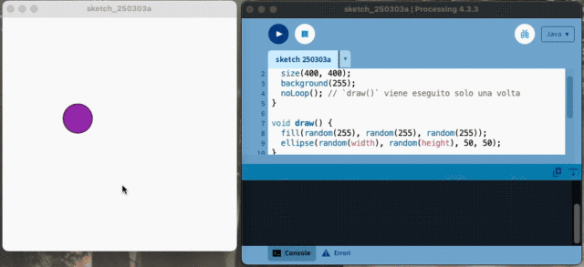 setup(): eseguita una sola volta all’inizio del programma.draw(): eseguita continuamente in un ciclo, permettendo di aggiornare la grafica in tempo reale.