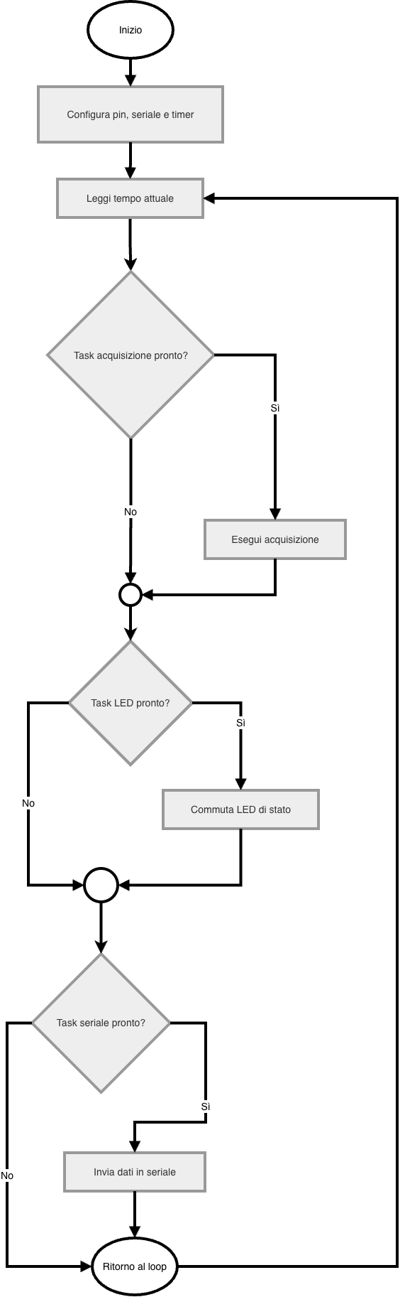 Il programma inizializza i timer dei tre task. Nel loop legge il tempo corrente e verifica uno dopo l’altro se è il momento di eseguire il task di acquisizione, quello di segnalazione e quello di stampa seriale. Se il tempo non è scaduto, passa al controllo successivo.
