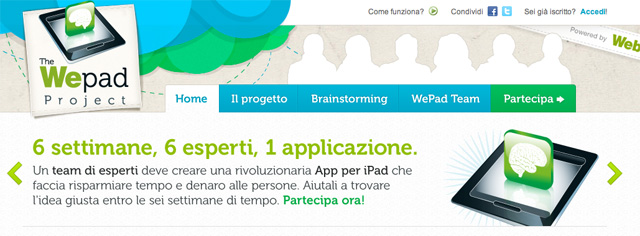 Realizzare in sei settimane un’applicazione iPad partendo da zero. Wepad Project un team di sei persone ogniuna con competenze diverse: il creativo, il blogger, il comunicatore, la tecno-mamma, il tecnologo, lo sviluppatore, tutti insieme una volta alla settimana si incontra per progettare e realizzare. Appena incominciati i lavori, tra le varie idee prese in considerazione: realizzare un’app per il risparmio di tempo e denaro.