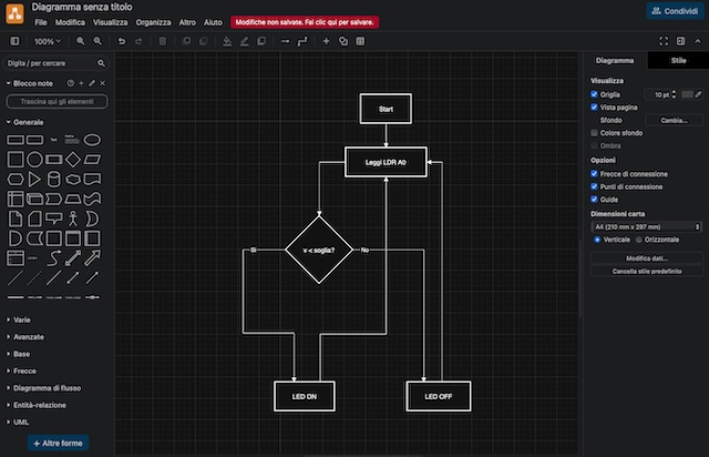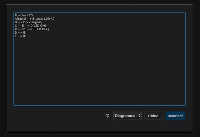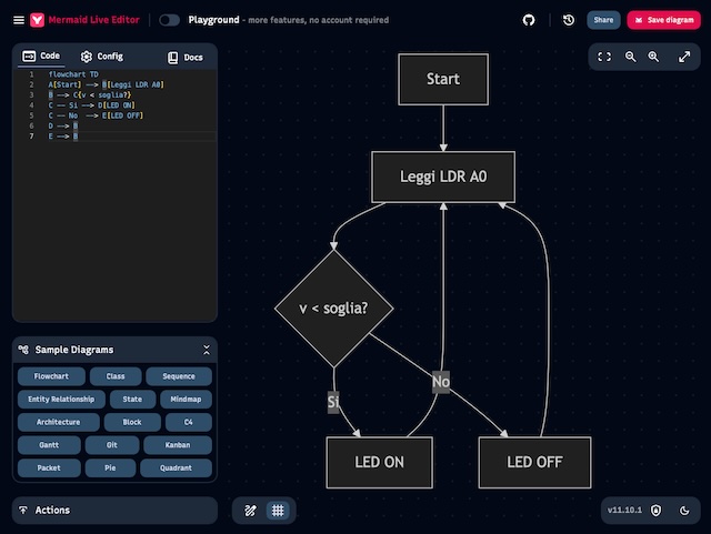 Obiettivo: leggo la luce con una LDR. Se il valore è sotto una soglia (buio), accendo il LED; altrimenti lo spengo. Stampo i valori su Serial.