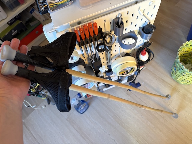 Ho riutilizzato alcune canne di bamboo che avevo in balcone come tutori per le piante, le ho tagliate a misura delle bacchette originali e ho modellato punta e tappo superiore in 3D. In punta ho inserito due inserti a stella (recupero da un vecchio avvitatore), mentre per il manico ho usato uno scampolo di tessuto plastico; i guantoni sono quelli recuperati dal vecchio set. Sul manico ho praticato un forellino per una fascetta che fissa i guantoni.