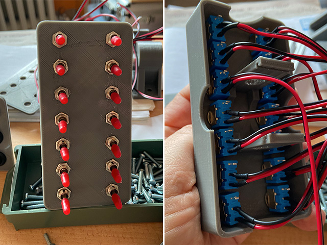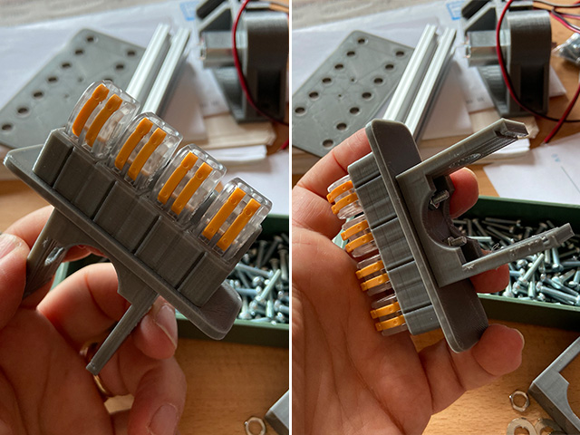 Ovviamente le dimensioni della struttura dipenderanno dalla lunghezza dell guida DIN, pertanto se avete necessità di lunghezze superiori ai 50 cm, come quella riportata nelle immagini che seguono, potreste stampare ulteriori supporti triangolari per reggere la guida ed evitare flessioni.
