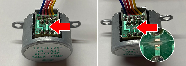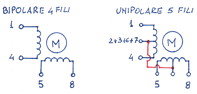 Sono presenti 5 fili di connessione che fanno riferimento alle bobine e all’alimentazione. All’interno del motore sono presenti due bobine, al centro di ogni bobine abbiamo la connessione alla tensione di alimentazione (5V o 12V) filo di colore rosso, mentre gli altri connettori:
