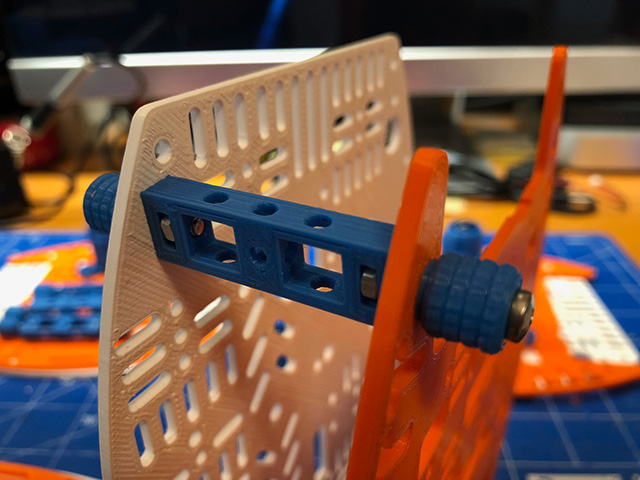 Anche in questo caso le parti che ho prototipato si sviluppano in altezza, a layer, ma di questo ve ne parlerò più avanti, vi mostro solamente una bozza di una versione che permette di utilizzare le parti frontali per avvitare altri elementi (sensori ad ultrasuoni, finecorsa, ecc…)