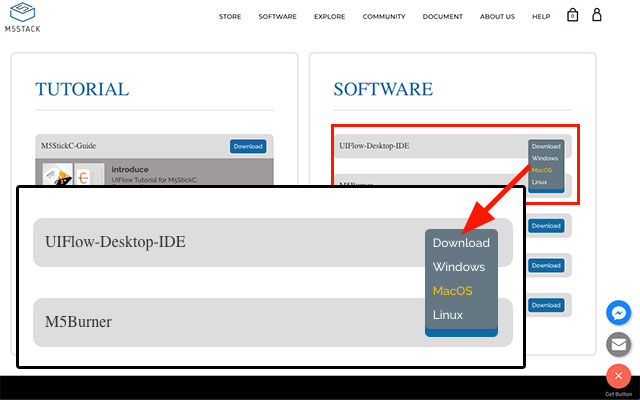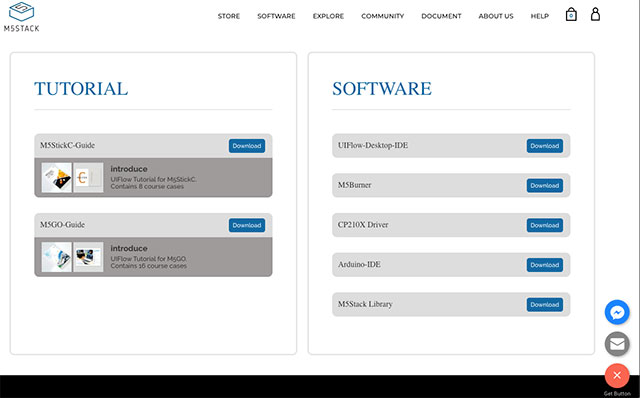 L’IDE UIFlow può essere utilizzato on-line oppure localmente scaricandolo dal sito principale. Per prelevarlo collegatevi al sito https://m5stack.com/ e selezionate dal menù principale: software > download:
