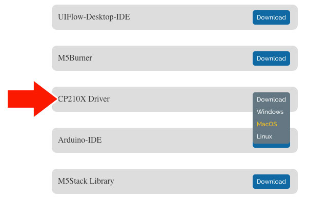 M5StickC non necessita di installazione driver per i sistemi operativi Windows 10, Mac (High Sierra+), Linux. Per altri sistemi operativi, oppure se il dispositivo non dovesse essere rilevato dai sopracitati SO dovete installare il driver CP210X per il vostro sistema operativo, il driver può essere prelevato sempre dall’area download.