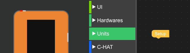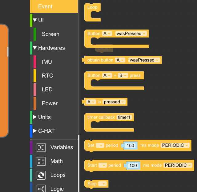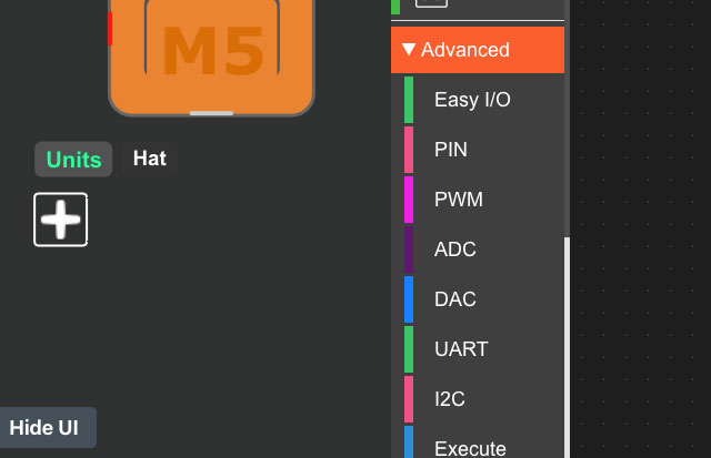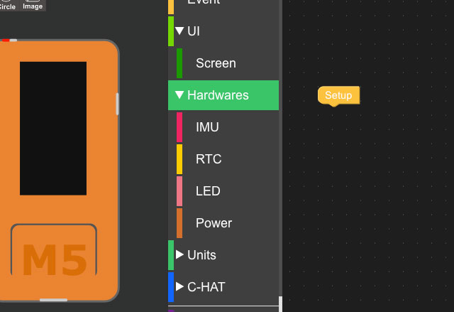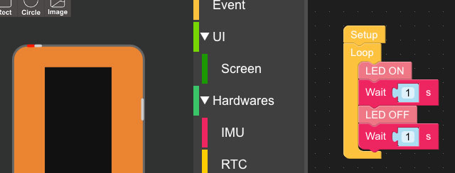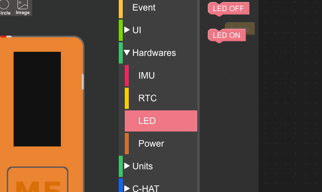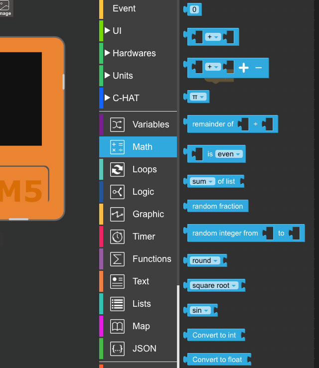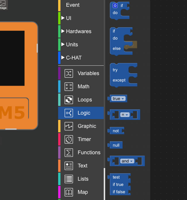 Contiene tutti i blocchi necessari per la programmazione. La sezione Hardware contiene le istruzioni che agiscono direttamente sull’elettronica dell’M5StickC. Troverete la sezione Math che include operazioni matematiche e Logic che raccoglie operatori logici e strutture di controllo.