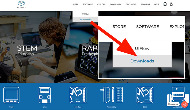 L’IDE UIFlow può essere utilizzato on-line oppure localmente scaricandolo dal sito principale. Per prelevarlo collegatevi al sito https://m5stack.com/ e selezionate dal menù principale: software > download: