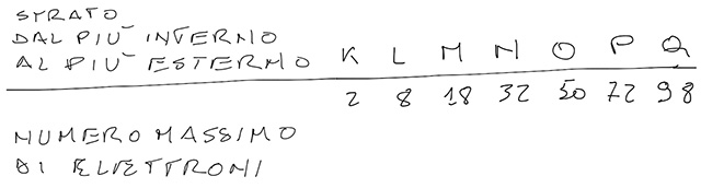 Ciascuno di questi strati, contraddistinto da una lettera dell’alfabeto, può contenere un ben preciso numero di elettroni, nella tabella che segue viene mostrata la corrispondenza tra strati e numero massimo di elettroni che possono essere contenuti: