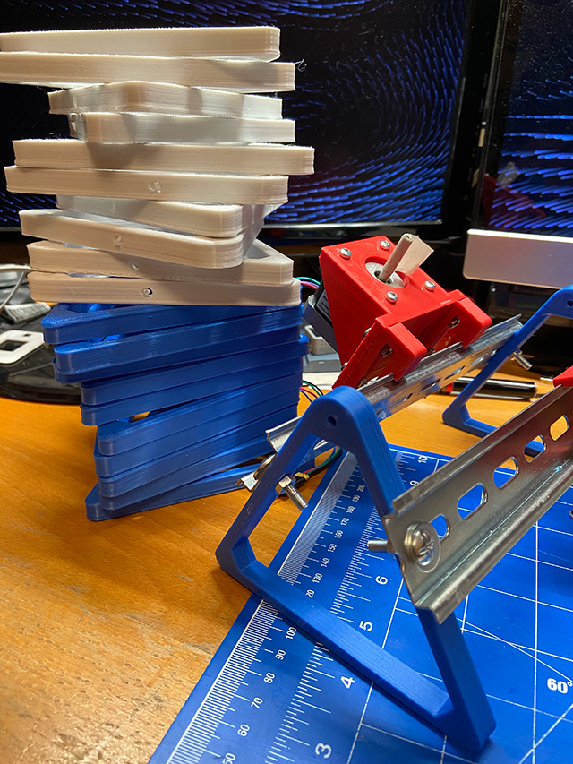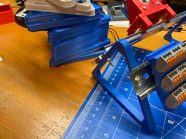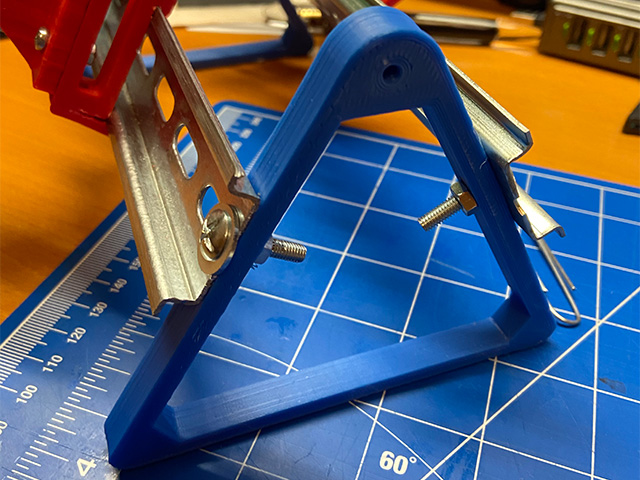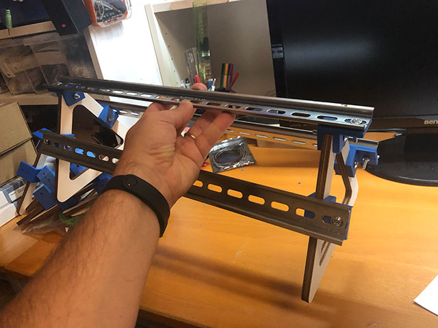 Ovviamente le dimensioni della struttura dipenderanno dalla lunghezza dell guida DIN, pertanto se avete necessità di lunghezze superiori ai 50 cm, come quella riportata nelle immagini che seguono, potreste stampare ulteriori supporti triangolari per reggere la guida ed evitare flessioni.