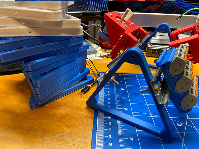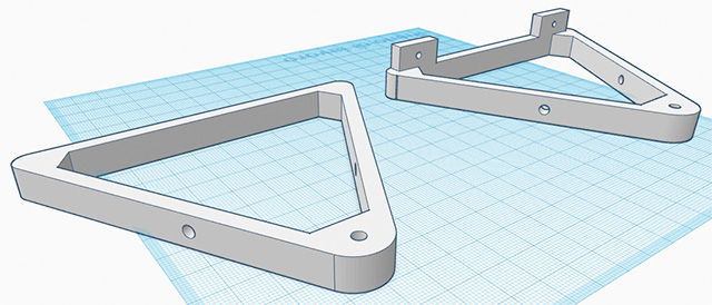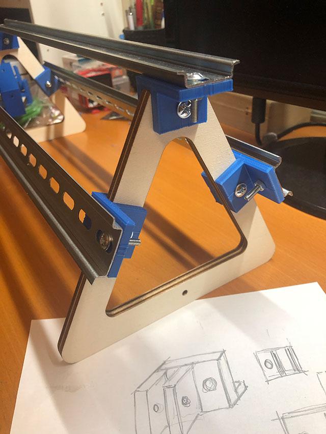 Ho progetto quindi supporto con due gambe triangolari su cui è possibile alloggiare, secondo necessità, al massimo 3 guide DIN e rispetto a soluzioni simili risulta più grande lasciando sufficiente spazio per le connessioni di input e di output degli apparati elettici.