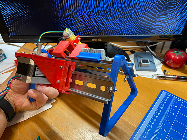I triangoli che fungono da sostegno hanno un’altezza di 16 cm ed una base di appoggio di 18 cm. Nel futuro laboratorio ci saranno anche pannelli fissi, ma la DIN rail stand XL mi permetterà di spostare velocemente gli apparati e costruire secondo le necessità isole di lavoro. Pensando quindi alla trasportabilità ho realizzato una maniglia che potrà essere agganciata sulla barra DIN superiore.