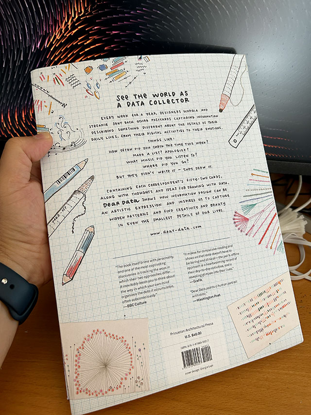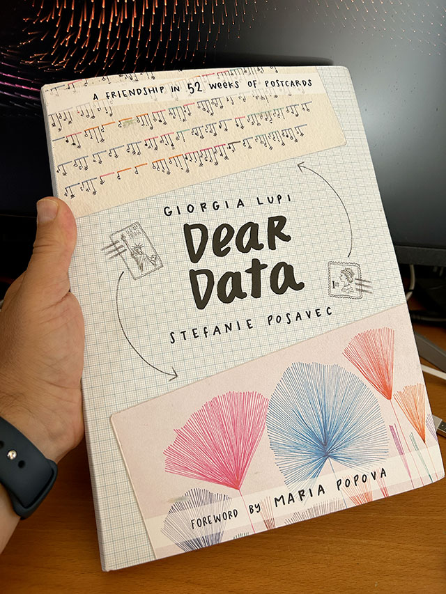 “Dear Data” colleziona 104 cartoline che Lupi e Posavec si sono inviate ogni settimana per un anno, tra settembre 2014 e settembre 2015; sul fronte di ogni cartolina viene mostrata l’infografica artistica e sul retro la modalità di interpretazione dell’infografica. Questo scambio epistolare, che narra attraverso i dati episodi della loro vita quotidiana, ha permesso di conoscersi meglio e creare un legame d’amicizia tra le due designer.