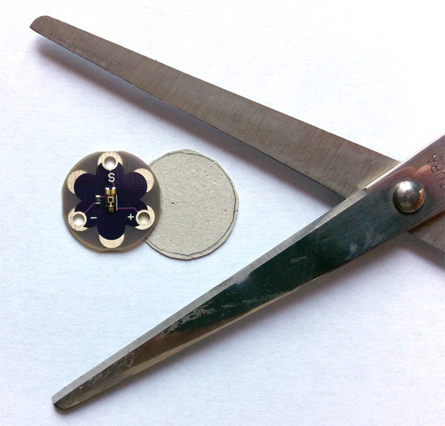 Come per le lezioni precedenti utilizziamo un cartocino di forma circolare per proteggere il circuito e per aumentare la presa dei morsetti a coccodrillo.