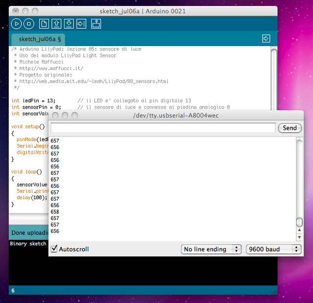 Non appena il LED si accende su LilyPad, si vedranno i valori del sensore comparire nella console di uscita e l’intervallo di valori oscillerà tra 0 (buio assoluto) a 1024 (luce piena):