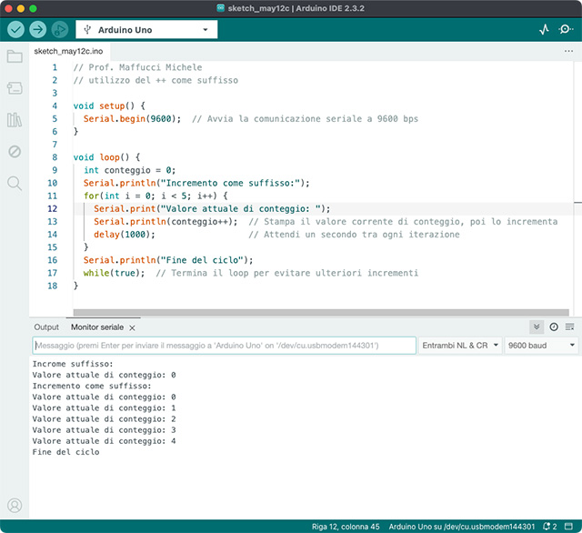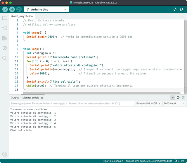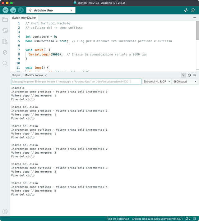 Si noti che nel loop() a ogni iterazione, si decide se usare l’incremento come prefisso o come suffisso, basandosi sul valore del flag “usaPrefisso”. Dopo ogni ciclo, il metodo di incremento viene alternato in questo modo vengono mostrati come i due metodi di incremento influenzano il valore della variabile contatore il cui valore viene stampato sulla Serial Monitor.