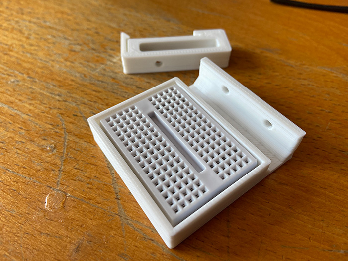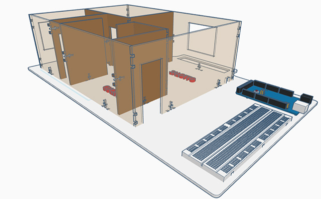 Le specifiche del kit sempre le solite: che stia sul banco di lavoro (480mm x 277mm), facilmente trasportabile, economico, di facile realizzazione (assemblaggio con colla vinilica o viti), da assegnare ad ogni singolo studente (importante!) e di compensato, in modo che possa essere prodotto rapidamente con il taglio laser che abbiamo a scuola. Ho realizzato una bozza del progetto a cui ho aggiunto una maniglia in modo che il kit possa essere traportato da un laboratorio all’altro come una valigetta.