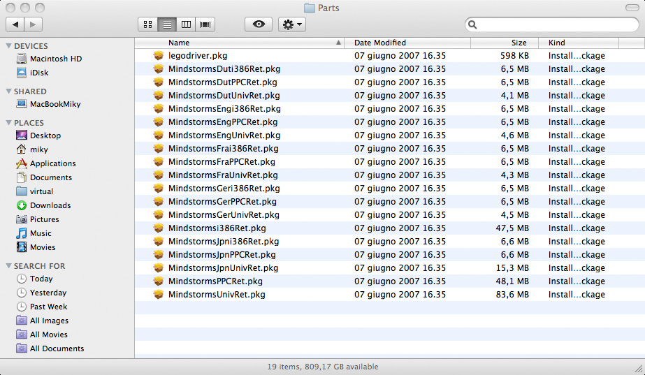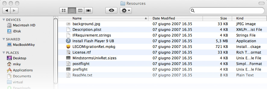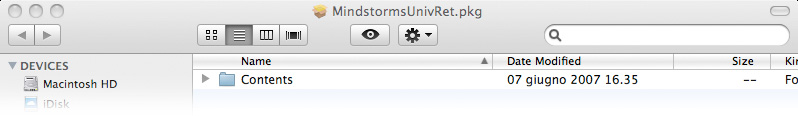 all’interno della cartella “Parts ” troverete una serie di file, cercate MindstormsUnivRet.pkg se possedete la versione retail o il file MindstormsUnivEdu.pkg se possedete la versione education (nell’immagine sotto è l’ultimo file della lista):