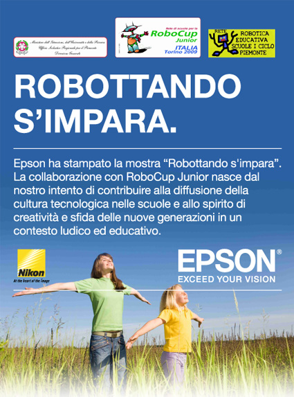 Il 14 maggio alle ore 14:50 nella sala Meeteng point di Camp1us al quarto piano di 8Gallery – Torino, sarà inaugurata la mostra fotografica “ROBOTTANDO S’IMPARA”, tra cui saranno esposte alcune delle foto che ho realizzato insieme a colleghi ed amici durante la manifestazione del 4 aprile. L’inaugurazione avverrà alla presenza del Direttore Generale dell’Ufficio Scolastico Regionale per il Piemonte Francesco de Sanctis, dell’Assessore alla Cultura, Protezione della natura, Parchi ed aree protette della Provincia di Torino Valter Giuliano, il Dirigente Scolastico dell’IPIA G. Galilei di Torino promoter della manifestazione Franco Francavilla, del Dirigente scolastico di Beinasco, capofila rete scuole primarie piemontesi per l’uso didattico della robotica Vincenzo Termini, Fabrizio Gillone Direttore Eventi NIKON – NITAL, Alberto Raviolo Direttore Marketing EPSON Italia s.p.a. , Silvia Carena PR Manager EPSON Italia s.p.a. e delle scolaresche che hanno partecipato a “ROBOTTANDO S’IMPARA” del 4 aprile 2009. Le scuole di ogni ordine e grado sono invitati a visitare la mostra che resterà aperta fino al 25 di maggio con orario dalle ore 09,00 alle ore 20,00. La mostra diventerà itinerante prima in Piemonte e poi nel resto d’Italia.