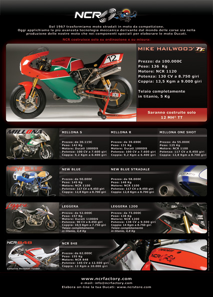 Oggi alle 20:15 ora italiana a Birmingham in Alabama (USA) al Barber Motorsports Park è stata presentata la NCR M4 una moto da sogno da 126 kg 132 CV a 8,700 giri – Coppia 14,3 Kgm at 7,000 giri, tanto titanio e carbonio. Vi allego le fotografie delle due versioni della M4.
