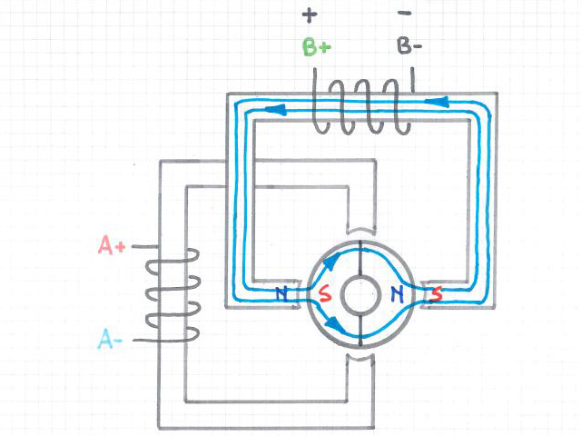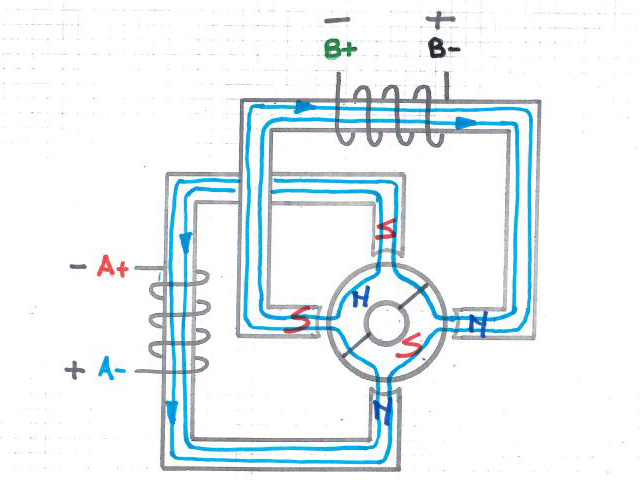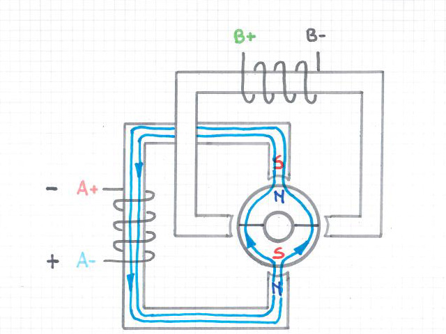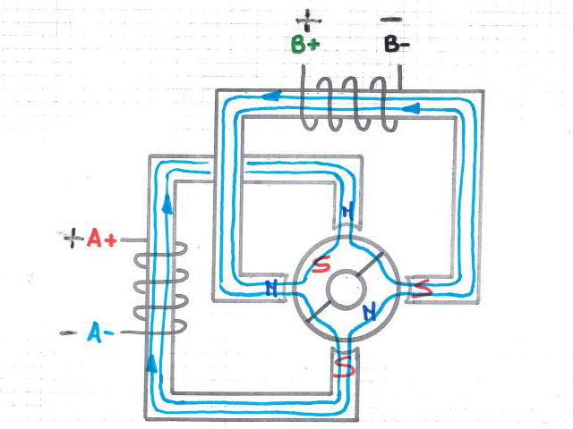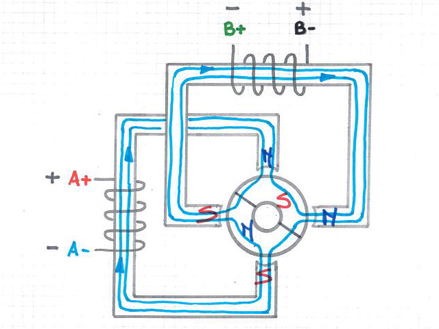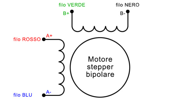 Sono presenti due avvolgimenti anziché quattro rispetto ad uno stepper unipolare. Entrambi gli avvolgimenti possono essere attivi in qualsiasi momento ma la polarità viene commutata su quattro fasi, ciò vuol dire che questo motore ha solo quattro fili anziché 5 (o 6 o 8).