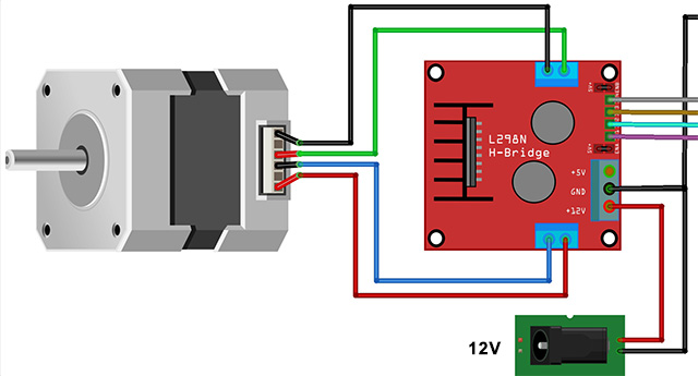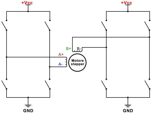 Elettronicamente il driver bipolare è costituito da un circuito elettronico a doppio ponte H, il nostro L298N, che consente di invertire il senso della corrente nelle bobine statoriche. Gli interruttori del circuito precedente vengono realizzati con transitor mosfet o bjt. Comandando la polarizzazione di coppie di transitor per ogni ponte H sarà possibile alimentare le bobine con polarità diverse.