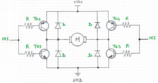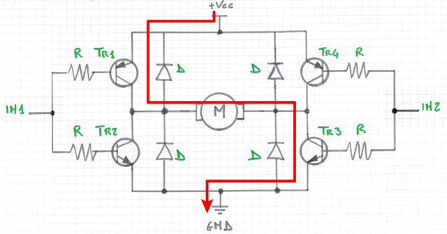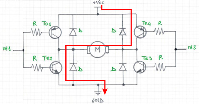 Quando nel punto IN1 si ha un valore HIGH e su IN2 un valore LOW, andranno in conduzionei transistor Tr4 e Tr2 provocando la rotazione in un senso del motore