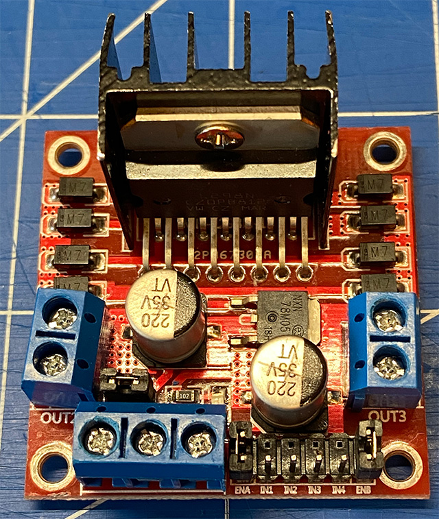 Mediante l’utilizzo di due output digitali di un microcontrollore invieremo sui pin IN1 e IN2 valori HIGH e LOW (tensioni di 5V e 0V) in modo da controllare la polarizzazione dei transitor e il conseguente verso di percorrenza della corrente che circola nella bobina statorica del motore.