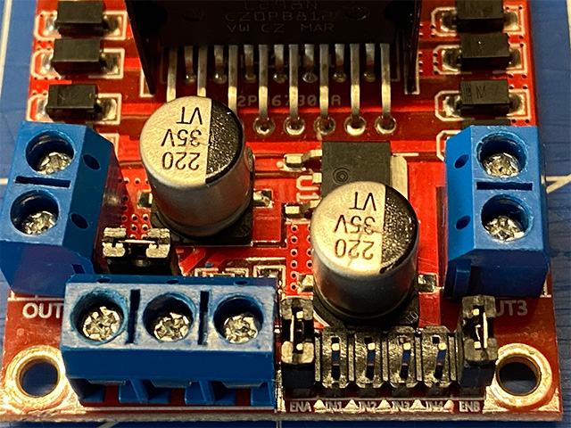 Collegare l’alimentazione esterna a 12V al terminale VCC e mantenere posizionare i jumper (i ponticelli) ENA ed ENB come indicato nell’immagine che segue in modo che il motore passo passo sia sempre abilitato al funzionamento.