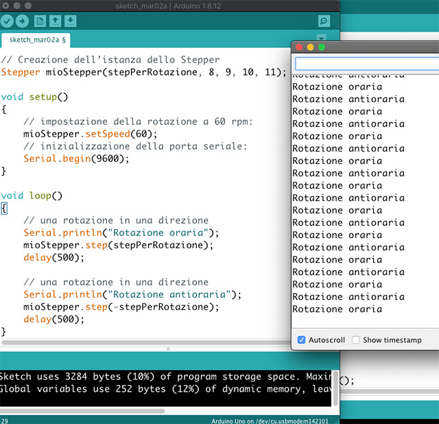 Lo sketch indicato di seguito, che potrete utilizzare come base di partenza per le vostre sperimentazioni, permetterà di controllare il motore passo-passo facendogli compiere ripetutamente un giro in senso orario ed uno in senso antiorario.