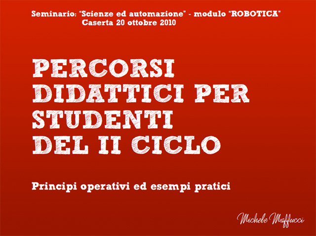 Per ora più che un metodo è un melting pot di idee e di letture che sto cercando di tradurre in una metodologia. Vi allego le ultime slide che ho utilizzato a Caserta durante il seminario “Scienza ed automazione” modulo “ROBOTICA” per raccontare la mia esperienza, con soddisfazione il mio intervento è stato apprezzato dai colleghi e dagli ispettori ministeriali.