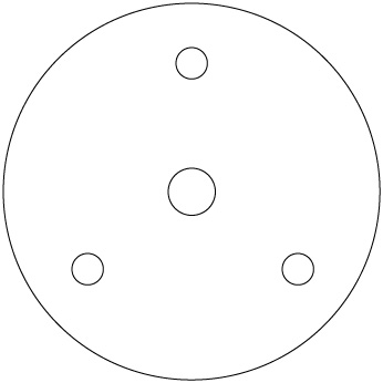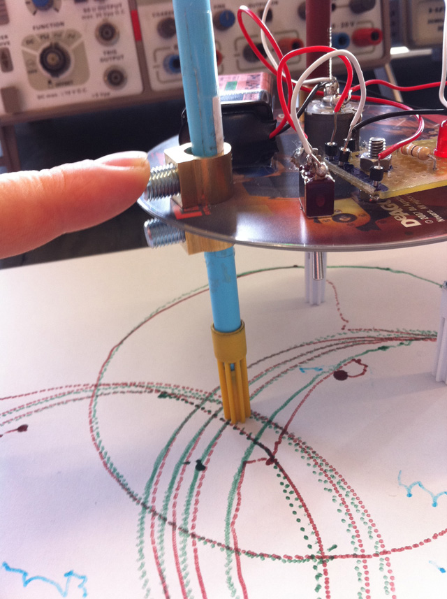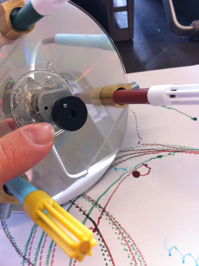 Realizzare 3 fori come da maschera allegata sulla superficie del cd-rom. I ragazzi consigliano di utilizzare un trapano con punta da 5 mm per forare lungo le circonferenze dove andranno ad essee inseriti i pennarelli.