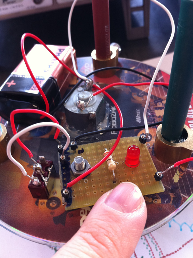 Allargate il foro centrale per consentire l’inserimento del motorino elettrico recuperato da una qualsiasi automobilina giocattolo. Incollate il motorino con colla a caldo.